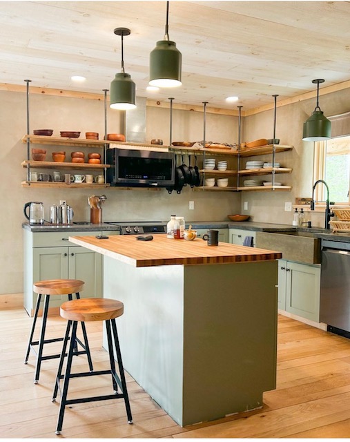 The design incorporates passive solar heating and cooling, optimizing natural light and warmth year‑round, while a VOC‑free interior ensures a healthy, breathable living environment. Sustainable details like recycled foam foundation insulation, metal roofing, slate tile, and Goshen stone bring both durability and timeless appeal to the home’s aesthetic.