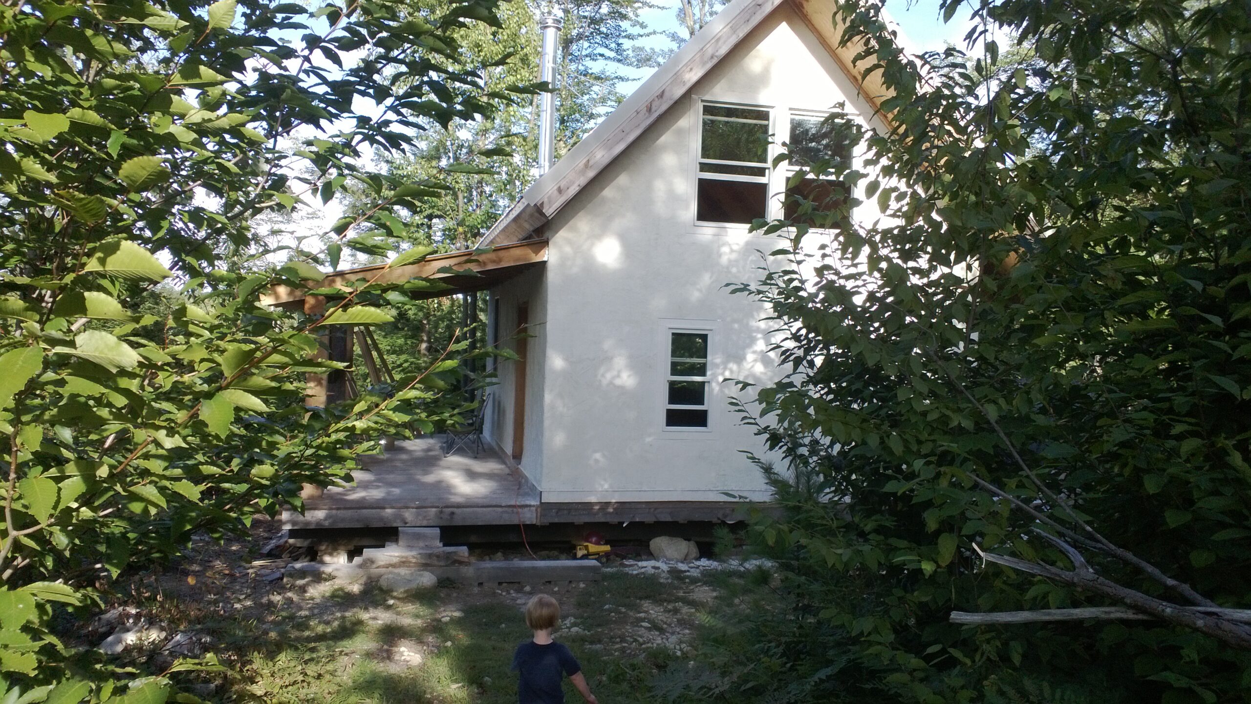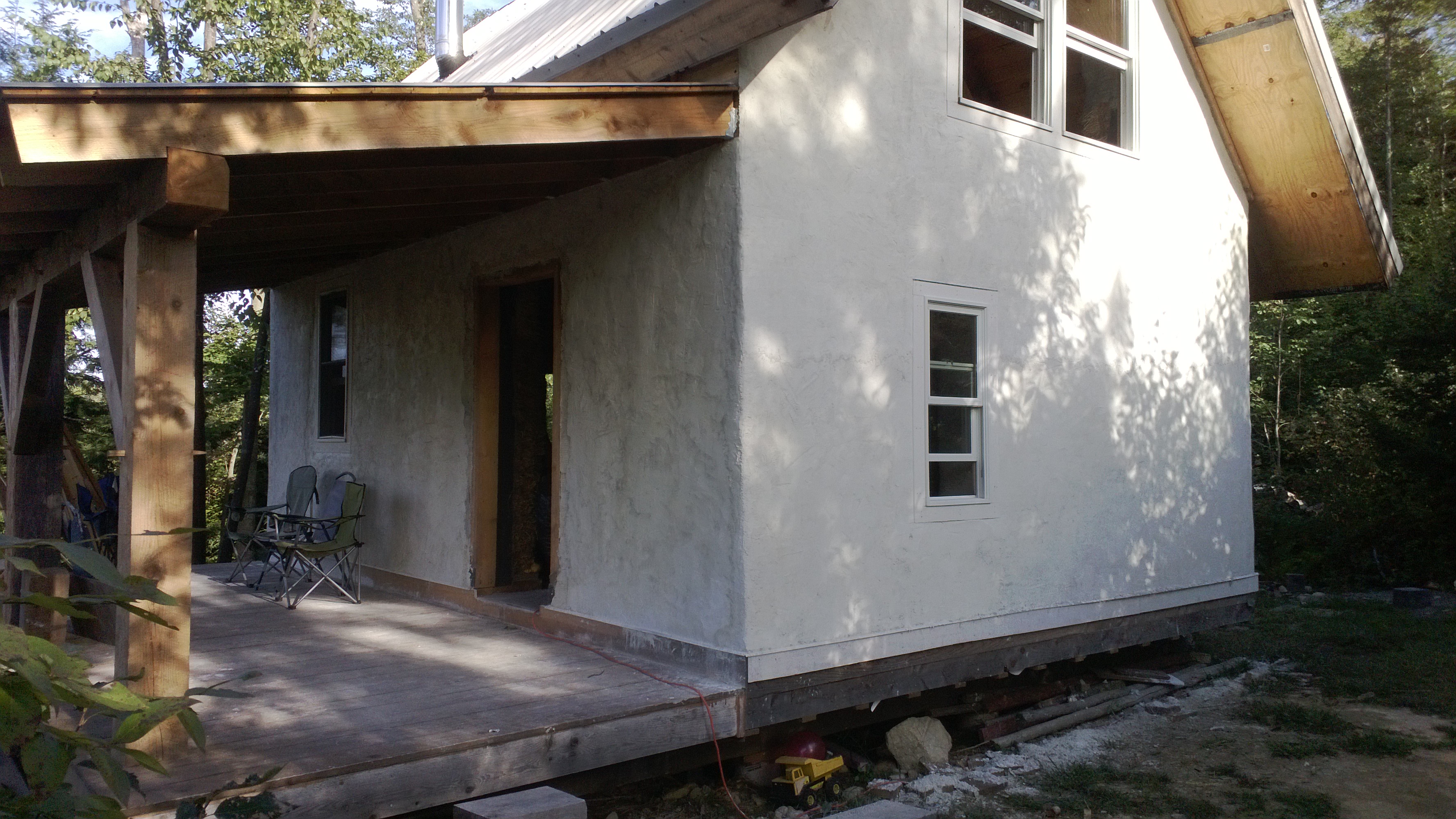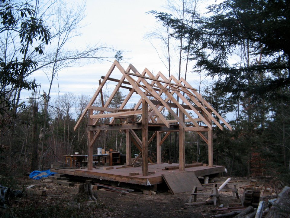 A highly sustainable structure: Yeoman Design Build worked extensively with owner/builder Dan Finklestein on this 600 sq.ft. four-season, Timber-frame, Straw-bale cabin. The cabin is built almost entirely from a handful of simple, local materials, and its environmental impact is minimal. The cabin features a traditional timber frame, True R-30 walls and an R-60 roof plane, wood-stove heat, a spacious front porch, and a 300 sq. ft. loft. Natural materials create a beauty and a feel unmatched by today’s mass-produced materials. This is one cozy little cabin.