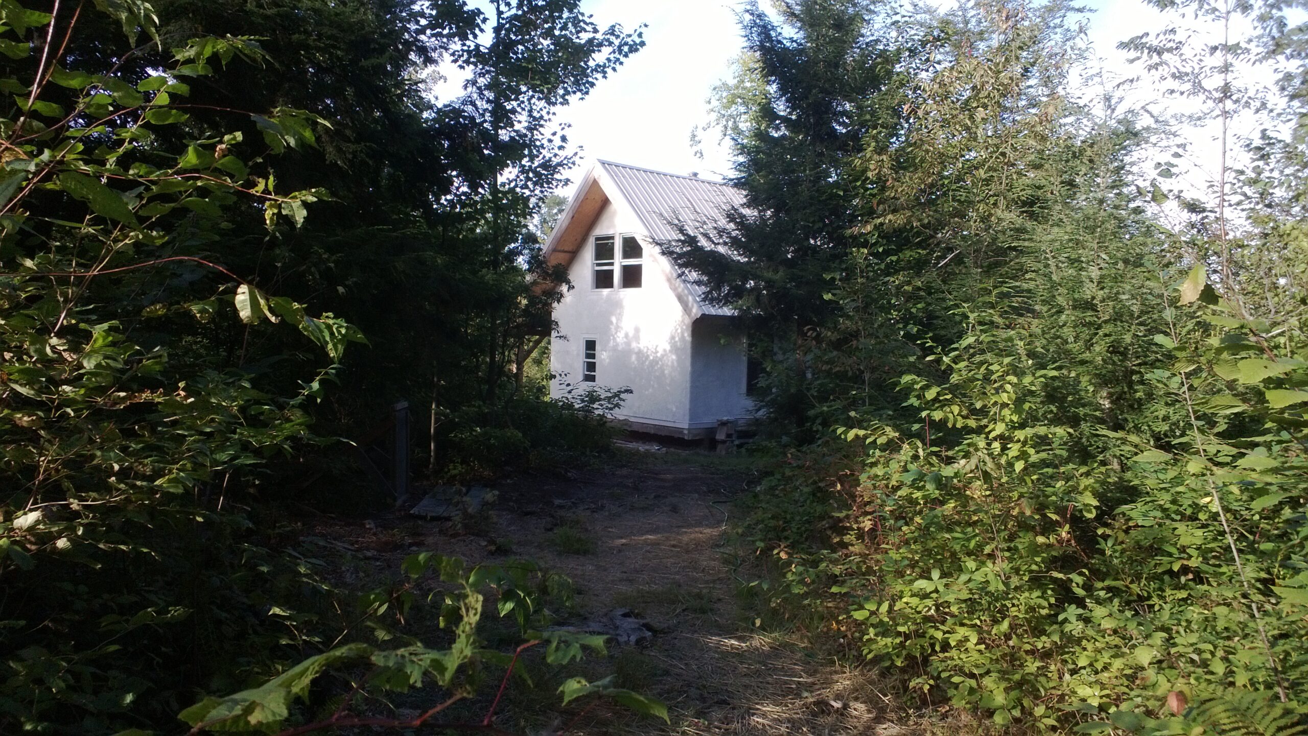 Timbers cut from trees on site; Straw-bales from a local farm; Plasters made from clay, sand, straw, and lime (most locally sourced); Metal roofing; Recycled windows and doors