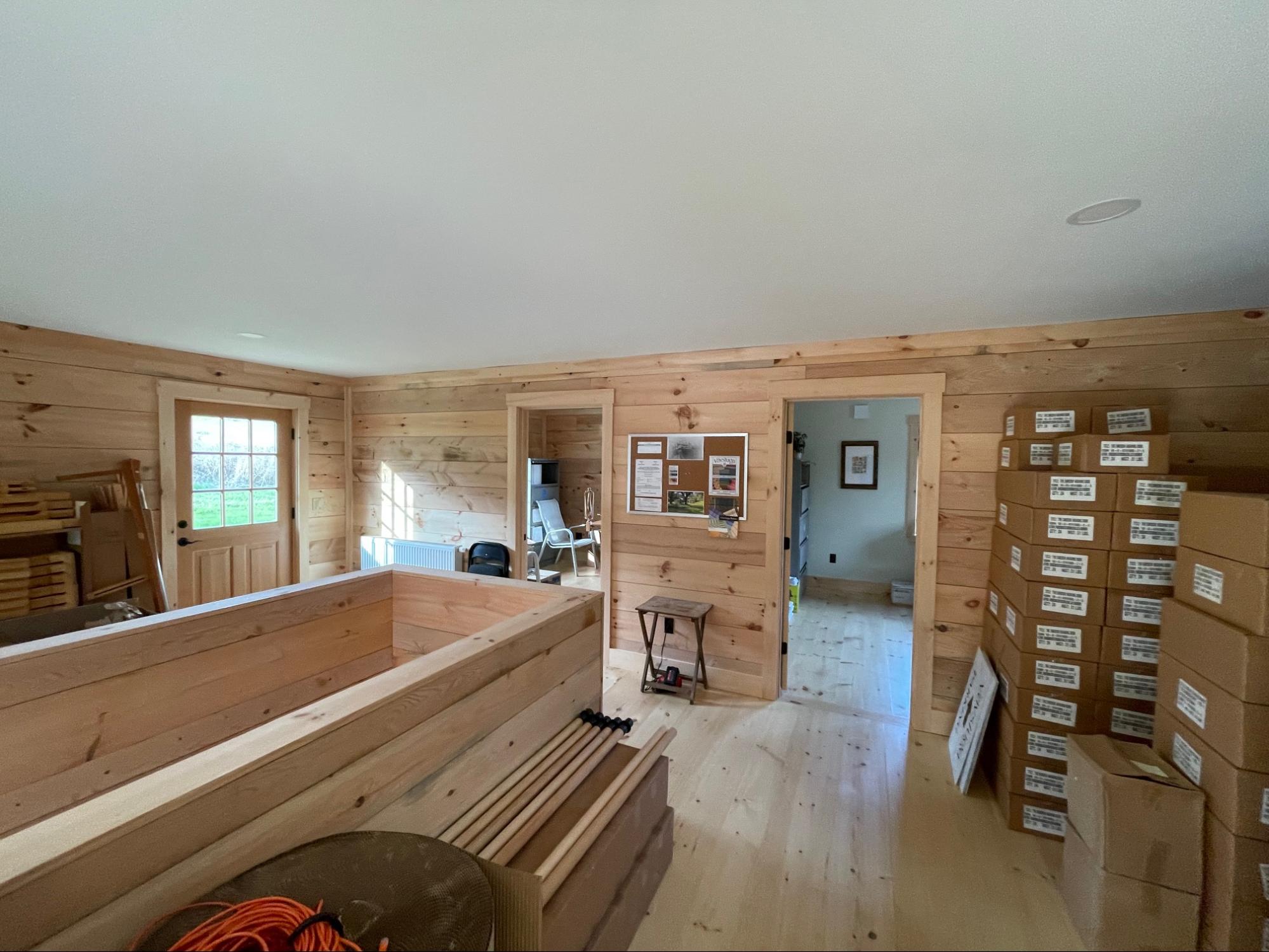 Approximately 80% of the lumber was milled directly from pine trees harvested on site, reducing transportation impact and creating a true connection between the building and its surroundings. The structure features locally sourced wood, Goshen stone, and a durable metal roof, combining natural beauty with long-lasting performance.